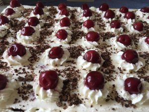 At least 4 hours before serving, you take the cold biscuit out and drizzle it with 2 oz Kirsch. Then spread the spirited cherry pie filling on it. Let it cool for an hour in the fridge (or cold place, safe from “predators”. Then spread half of the spirited whipped cream. The other half is for decorating the cake. If you have chocolate flakes, that can be used as well for decorating.